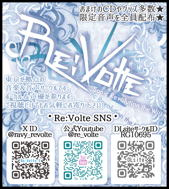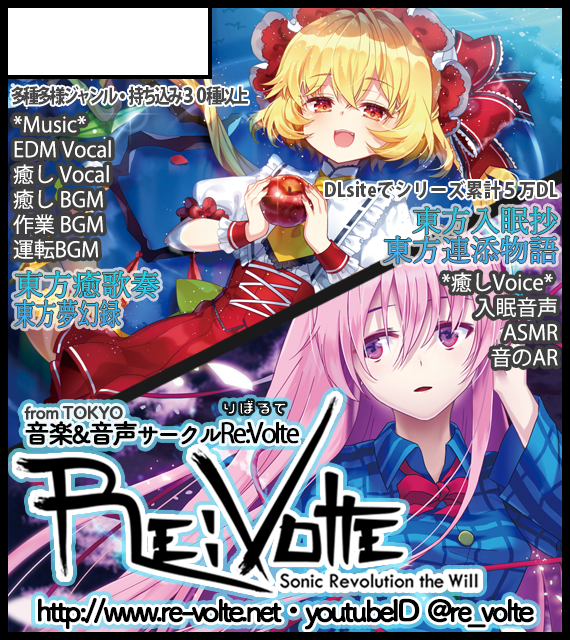 サークル説明 東京から参加の、音楽&音声サークルです。 ボーカルや、作業BGM系、EDMやクラブ系や、癒やし系、 音声は、ほんとに眠れる『東方入眠抄』 臨場感MAXの「連添物語」等多数。 お迎え枚数に応じて、おまけCDやグッズもプレゼント★