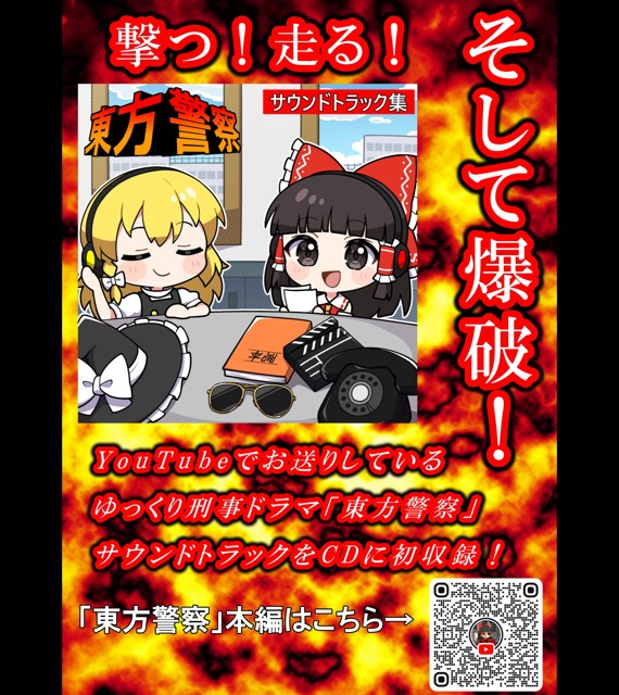 サークル説明 当サークルで制作しているゆっくり刑事ドラマ「東方警察」のサウンドトラックCD。全16曲を収録。劇中でこいしが歌っている「私はこいし」とエンディング曲「私の愛する幻想郷」は歌詞付きです。