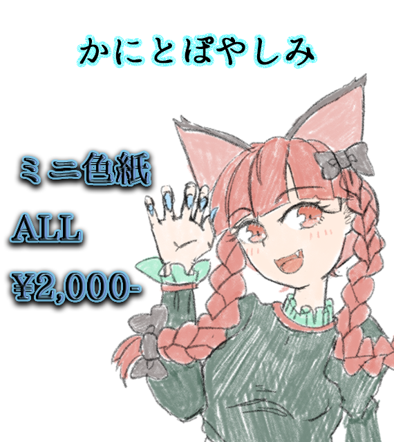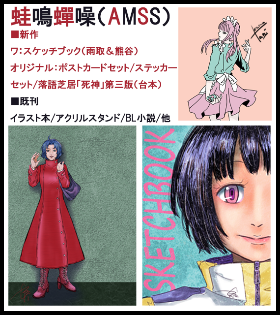 サークル説明 【新作】オリジナルのポストカードセットやステッカーセット、ワートリ千佳ちゃんと熊ちゃんが表紙裏表紙のスケッチブック落語芝居「死神」の第三版台本。 【既刊】弱ペダのイラスト本やアクスタ、オリジナルのシットコム台本、写真詩集、R18nmmnBL小説。 一次創作(蛙谷十二)と二次創作(蝉山四一)のごった煮です。