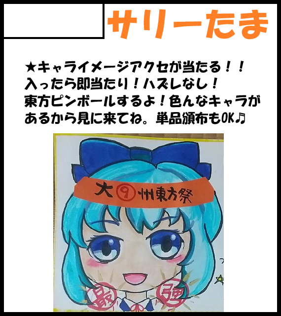 サークル説明 新刊! チルノが主人公のギャグ漫画です。 大妖精、文、椛の出番が多めです。 その他シール系のグッズと直筆色紙を予定しています。ゾンサガもあるかも?!