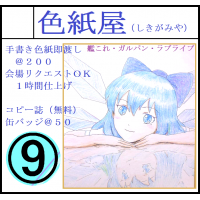 手書き色紙(東方中心、艦これ、ガルパン、ラブライブ)、缶バッジ(東方キャラのアイコン等)、コピー誌(東方、マンガとイラスト)