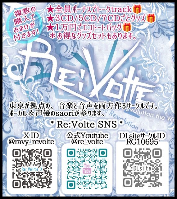 サークル説明 東京拠点の、音楽&音声サークルです。 ボーカルとインスト、EDMやクラブ系や癒やし系、 音声は、大好評ロングセラーのほんとに眠れる『東方入眠抄』 臨場感MAXの「連添物語」等多数。 ジャケット絵のグッズもあります。購入の枚数に応じて、おまけCDやグッズもプレゼント★