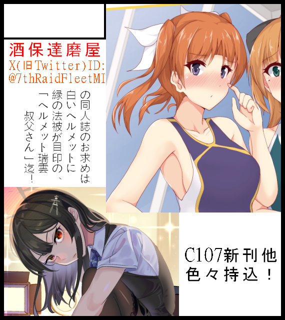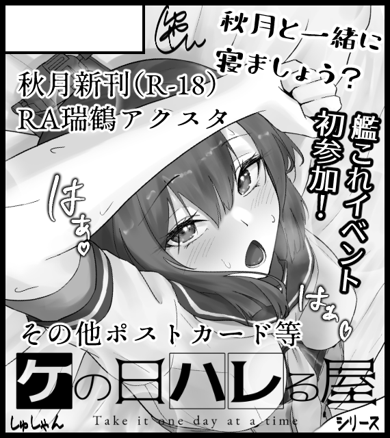 サークル説明 【提督、一緒に寝ませんか? ~秋月~】 提督(司令)から指輪をもらった秋月。口が滑って一緒に寝ることになってしまった初夜、何も起きないはずもなく…? 初の艦これ同人誌、果たして出来栄えはどうなるか…? 【瑞鶴RAmodeアクスタ】 Xをフォローしてくれている方はもうご存じ! レースアンバサダーmode瑞鶴のアクスタ!!17cm超えの大きさに、くびれと肉付きの良さがポイント! なお在庫少なめ!! 【各種ポストカード】 これまでXやPixivに投稿してきたイラストを中心に、ポストカード用に編集したものを印刷予定!