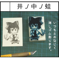 手彫りの消しゴムはんこをメインに、消しゴムはんこを利用したプラバンストラップをサブに取り扱います。多くのキャラクターを取り扱うので、サークルカットのキャラクターに関係なく配置をお願いします。