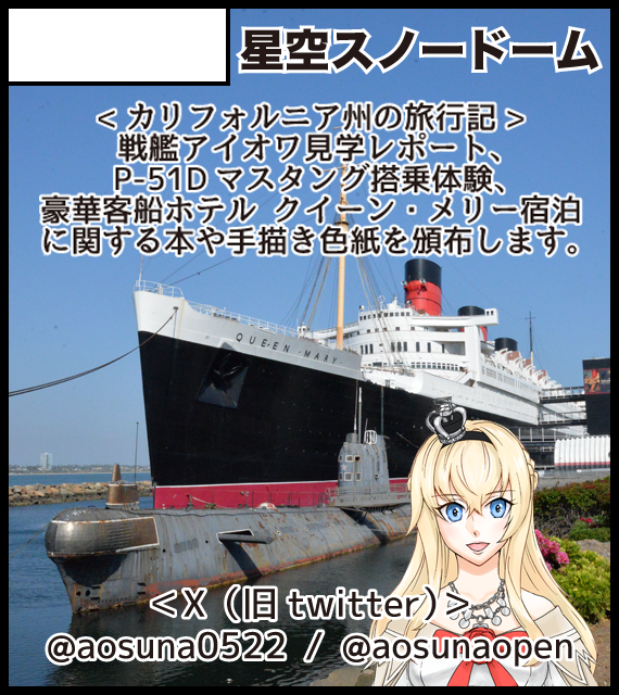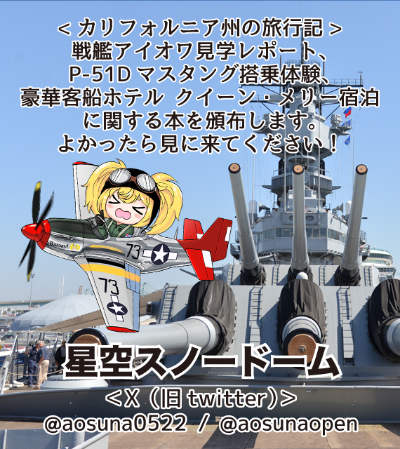 サークル説明 ・アメリカ旅行記 新刊「豪華客船クイーン・メリーに泊まろう」頒布予定。 ・既刊 戦艦アイオワ見学本、P-51Dマスタング飛行体験本頒布。 ・毎度好評!手書き色紙頒布予定。