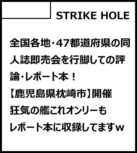 サークル説明 同人誌即売会レポート本。伝説の枕崎艦これオンリーなどもご紹介しております。
