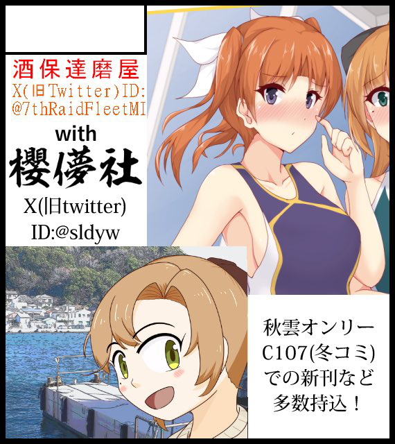 サークル説明 秋雲オンリーで頒布した「連れてってよ(Re.)※一般」や「ダウナー系親潮レイヤー(成年)」など、一般成年問わず頒布します。あと、櫻儚社さんの同人誌も委託頒布します。